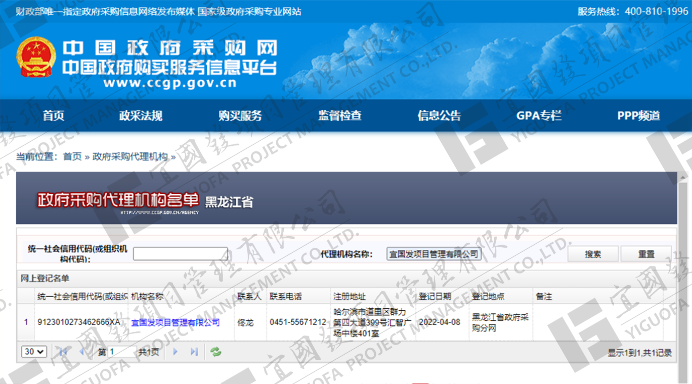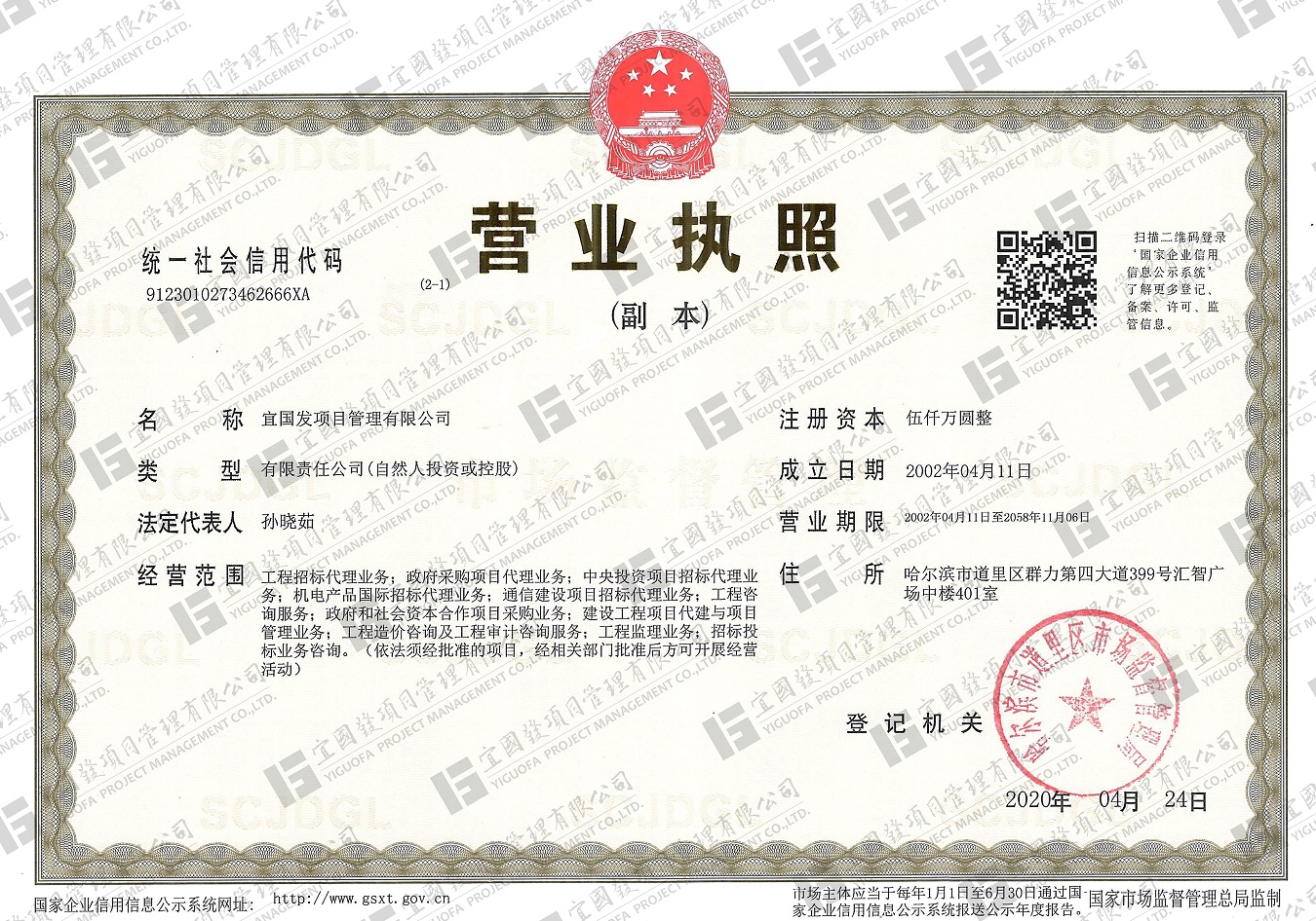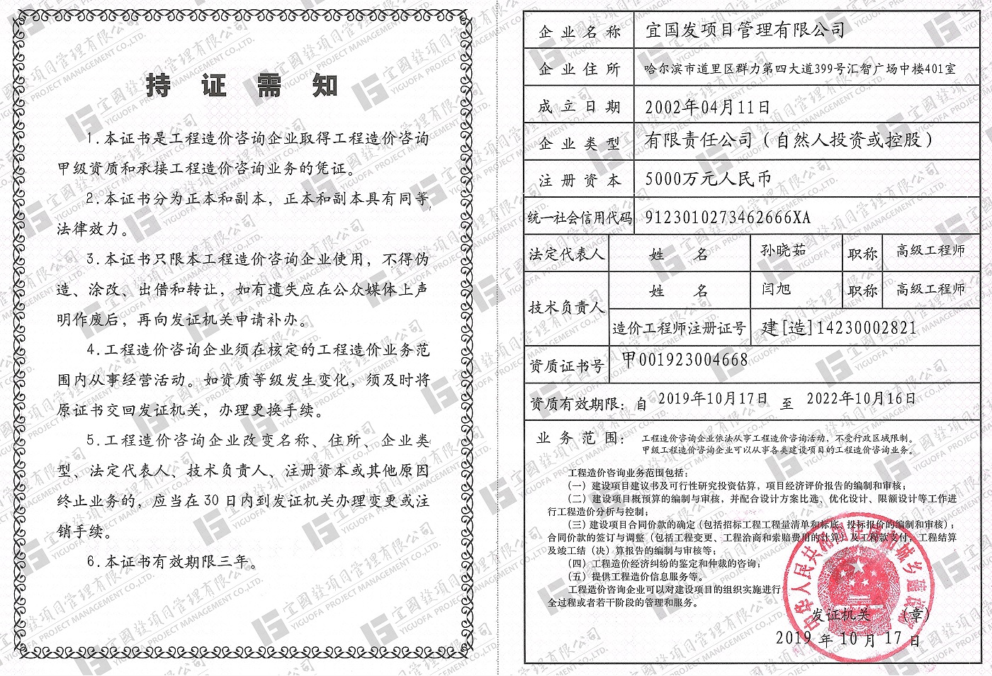 宜國發(fā)項目管理有限公司(原名黑龍江國發(fā)項目管理有限責任公司)成立于2002年4月,公司注冊資金5000萬元人民幣,具有獨立法人資格。現具備國家住房和城鄉建設部頒發(fā)的工程招標代理機構甲級資質,發(fā)展和改革委員會頒發(fā)的中央投資項目招標代理機構甲級資質、財政部頒發(fā)的政府采購代理機構甲級資質,黑龍江省住房和城鄉建設廳頒發(fā)的工程造價咨詢企業甲級資質,并已納入全國投資項目在線審批監(jiān)管平臺工程咨詢單位備案名單、“中國政府采購網”政府采購代理機構名單及“中國國際招標網”機電產品國際招標代理機構名單,且通過了質量管理體系、環(huán)境管理體系、職業健康安全管理體系認證。